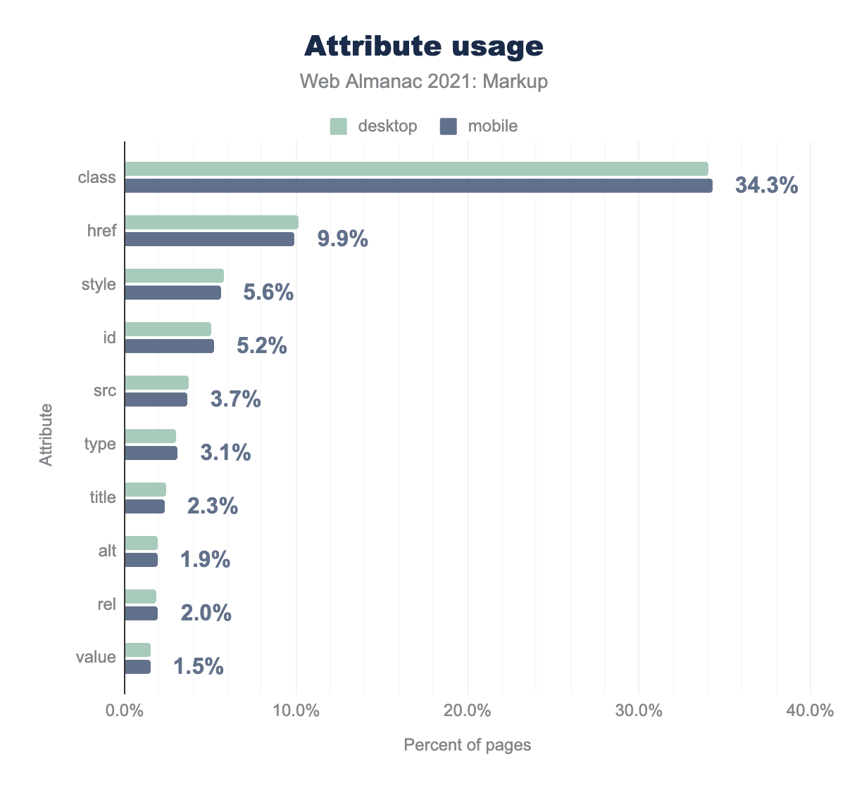 The second most popular attribute is href, with 9.9% of occurrences. With links being part of the fabric of the web, it’s not surprising an anchor element attribute was this popular. What was surprising is that the src attribute was only twice as popular as the alt attribute, despite it being available to considerably more elements.