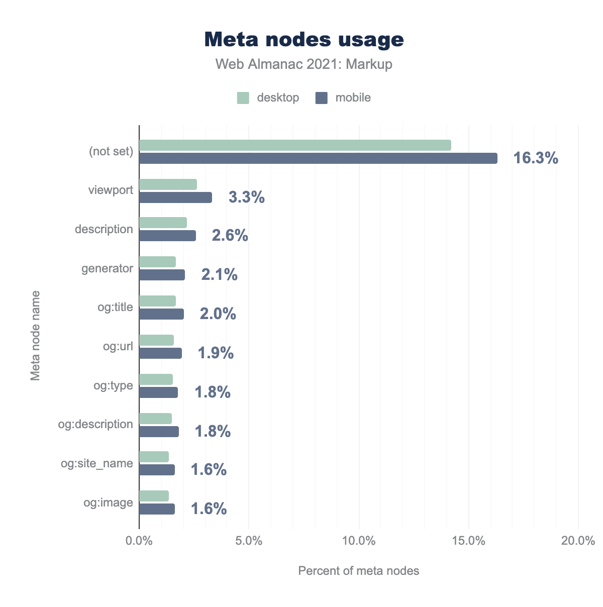 The most popular is viewport information, with the most popular viewport value being initial-scale=1,width=device-width. 45.0% of mobile pages scanned used that value.