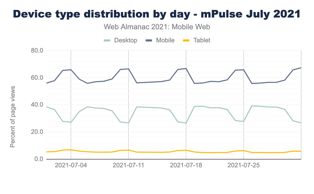 Fortunately, there are a few other sources. Paul Calvano ran some analysis on the Akamai mPulse real user monitoring data for July 2021. It found a slightly more even match between Mobile and Desktop traffic, at 59.4% being from mobile devices. The mPulse data is aggregated hourly, so it reveals some interesting trends