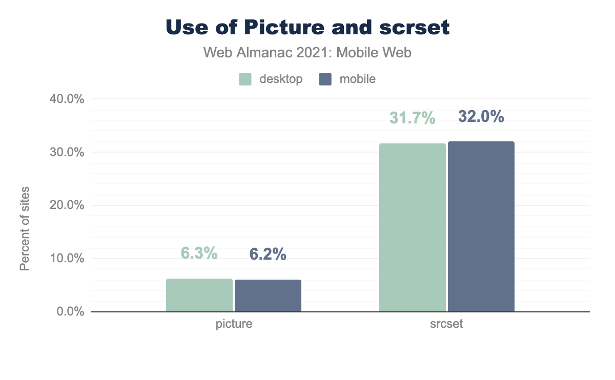 <picture> elements (compared to 6.3% of desktop sites) and 32.0% used srcset attributes (compared to 31.7% of desktop sites) to load images responsively.<picture> and srcset to serve responsive images.