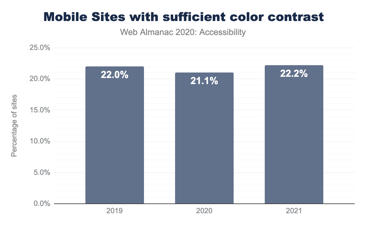Despite the potential for increased conversion, 77.8% of sites failed Lighthouse audits for use of sufficient color contrast. This is a slight improvement year over year.