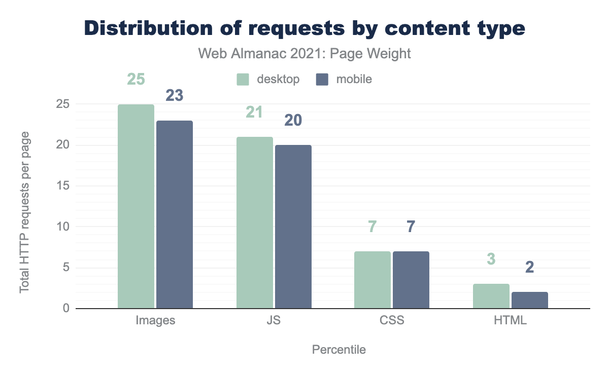 Images again make up the largest number of requests, though JavaScript is closing in as the gap has narrowed slightly in the last year. Images shows a reduction of 4 requests between the two years—perhaps a result of more lazy-loading since this was made available natively via simple HTML attributes?