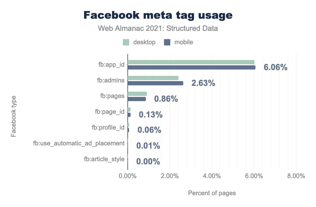 Less common still is more specific metadata about the og:image tag, in the form of og:image:width (12.95% of pages), og:image:height (12.91% of pages), og:image:secure_url (5.61% of pages) and og:image:alt (1.75% of pages). It’s worth noting that with HTTPS adoption now increasingly the norm, og:image:secure_url (which was intended to identify a https version of the og:image) is now largely redundant.