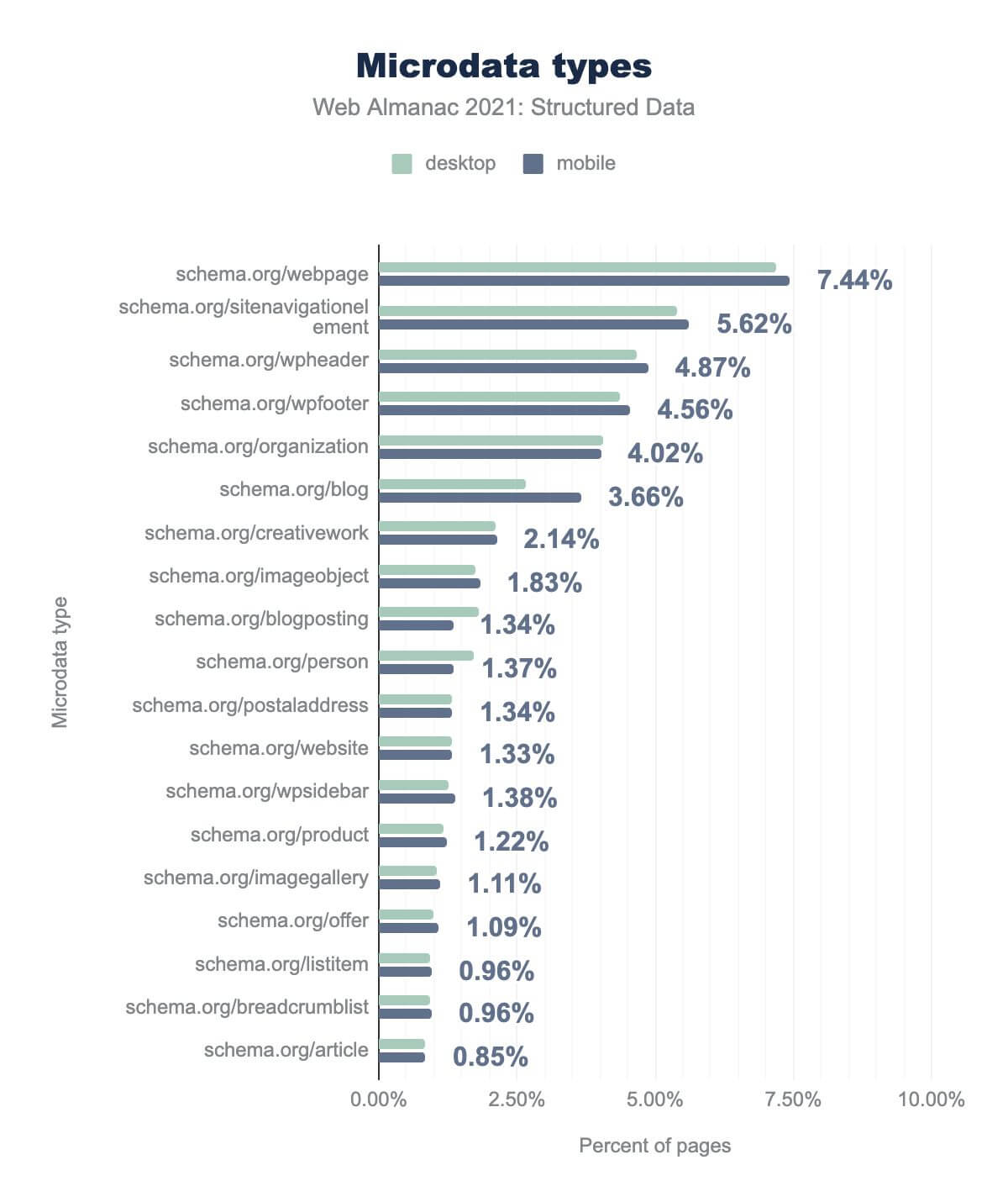 Website is on 8.90%, Organization is on 6.00%, LocalBusiness is on 1.67%, BreadcrumbList is on 1.45%, WebPage is on 0.97%, ItemList is on 0.50%, Product is on 0.60%, BlogPosting is on 0.46%, Person is on 0.30%, Article is on 0.30%, AutoDealer is on 0.23%, Corporation is on 0.20%, Event is on 0.17%, Store is on 0.16%, VideoObject is on 0.15%, FAQPage is on 0.14%, Restaurant is on 0.18%, and ApartmentComplex is on 0.11%. Desktop usage is similar.As we might expect, our findings are similar to our findings from evaluating the use of microdata. That’s to be expanded, as both approaches are heavily skewed towards the use of schema.org as a predominant standard. However, there are some interesting differences.