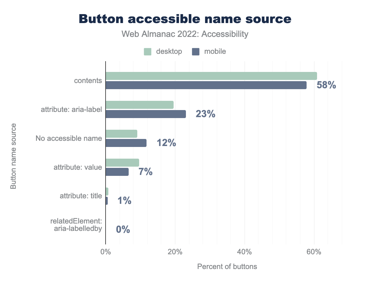 We found that 61% of buttons on desktop and 58% in mobile sites get their accessible name from content which is good. We also found that 20% of buttons on desktop sites and 23% of buttons on mobile sites get their accessible names from the aria-label attribute.