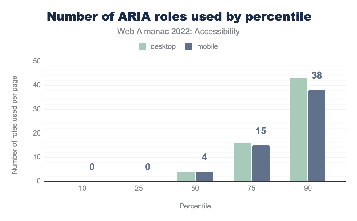 We found that 33% (up from 29% in 2021, and 25% in 2020) of desktop and mobile sites had home pages with at least one element with an explicitly assigned role="button". This increase in percentage is likely not good since this indicates that websites are either creating custom buttons using <div> or <span>, or are adding a redundant role to <button> elements. Both of these are bad practices and go against the first rule of ARIA. Following this rule, one should always use a native HTML element—in this case, <button>—when possible.