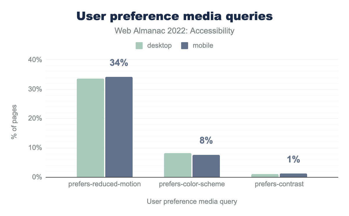 8% of desktop and mobile websites used the prefers-color-scheme media query, while 1% of desktop and mobile sites used prefers-contrast. Both of these media queries improve content readability by adjusting the display mode based on the user’s preference. prefers-color-scheme allows the browser to detect the user’s system color. Using this information, the web developer can then provide a light or dark mode accordingly. prefer-contrast is useful for users with low vision or photosensitivity who may benefit from high contrast modes.