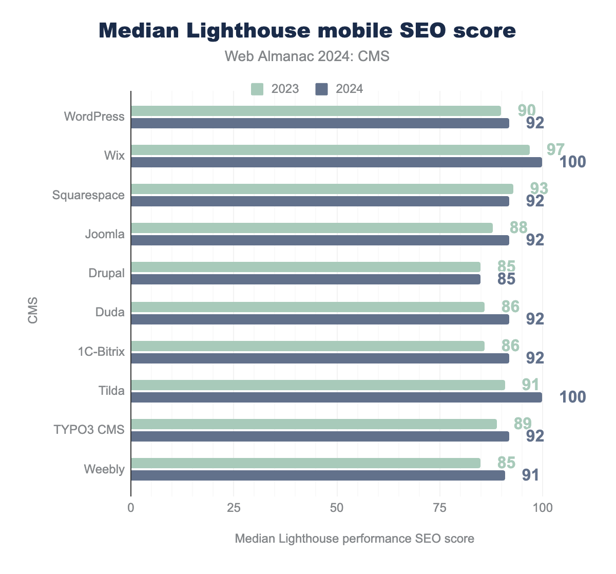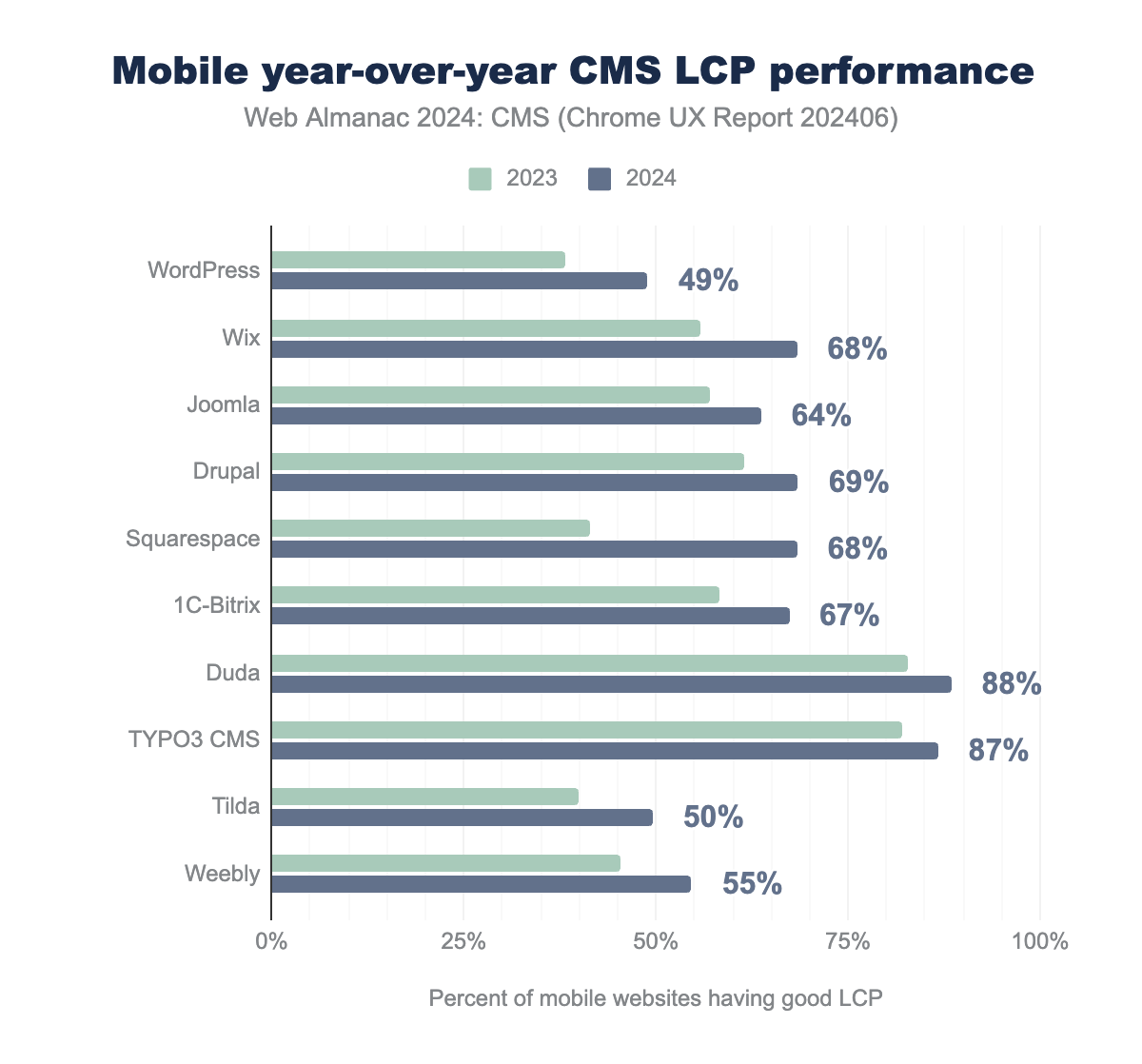 Considering how much they have improved since 2023, Squarespace is again ahead of the other CMSs with a YoY improvement of 27%. Wix is in second place with 13%, and WordPress is third with 11%. The remaining platforms improved by less than 10%.